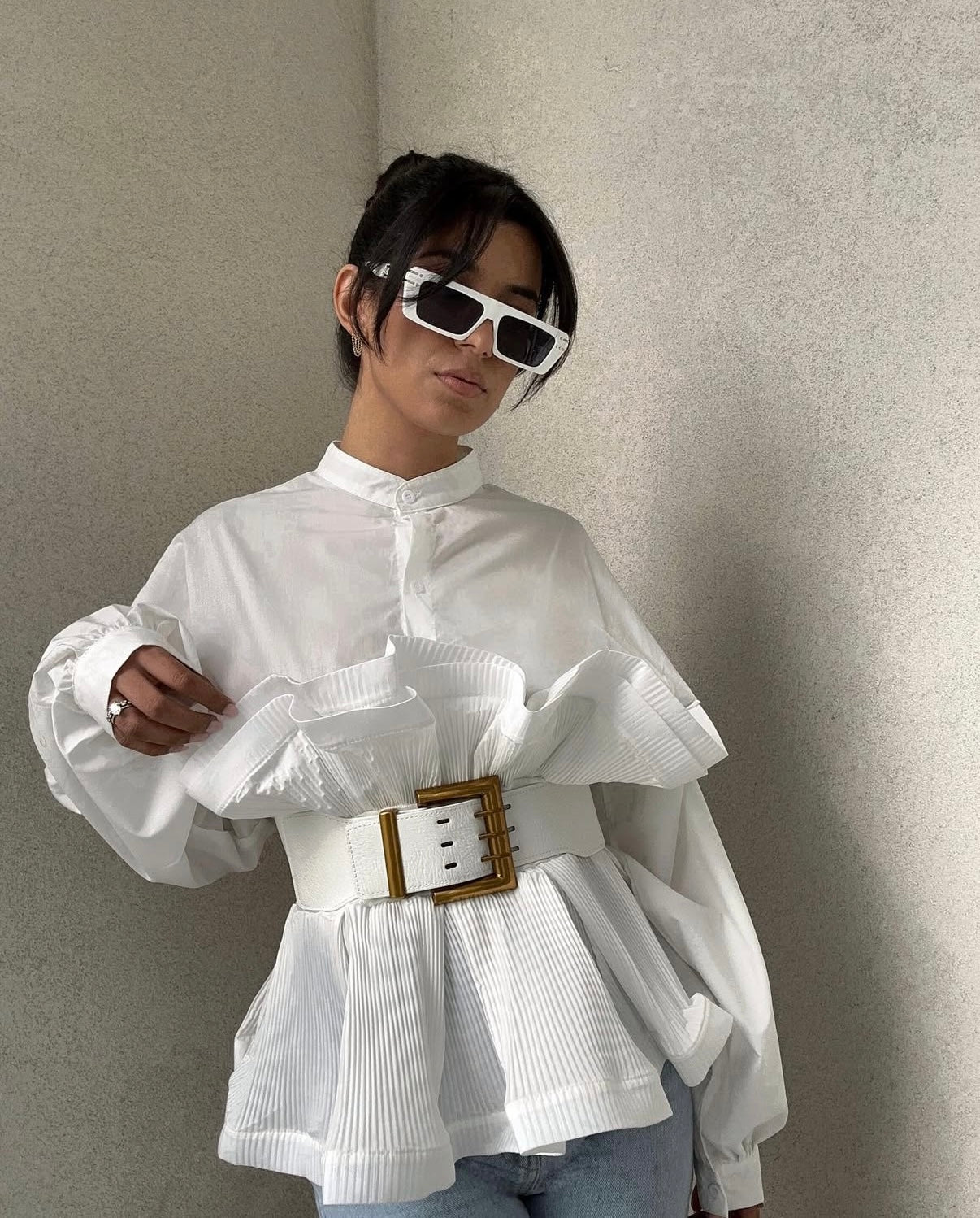 Deze blouse is alles wat je zoekt voor een effortlessly chic look. Met de puffy sleeves, speelse ruffles en de bijgeleverde massive riem met gouden details, maak je in één keer een statement.