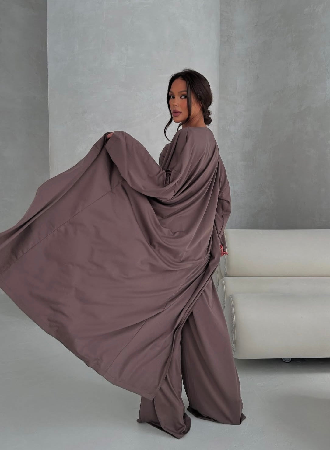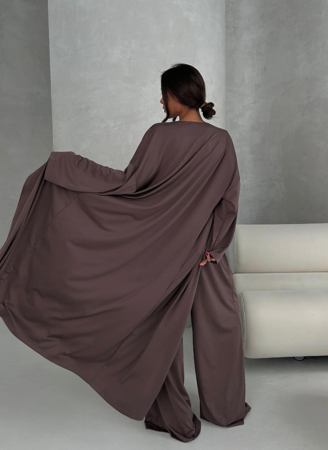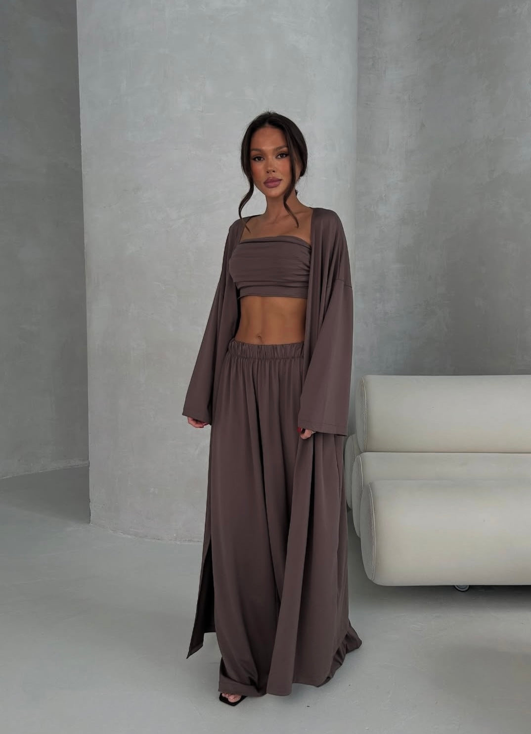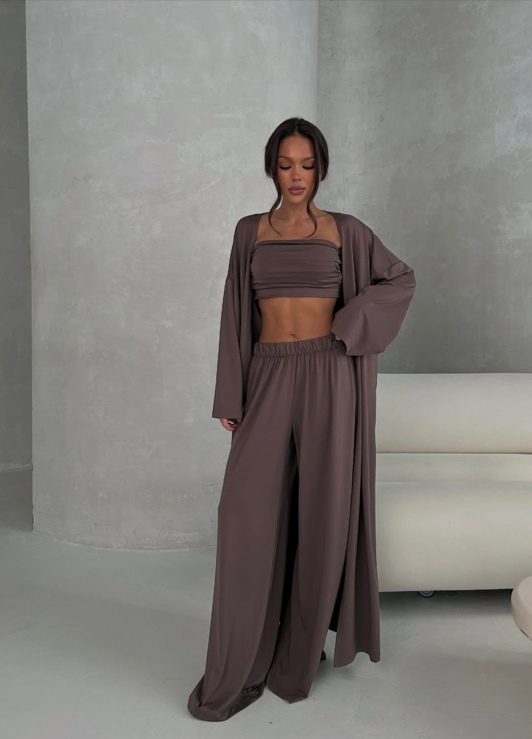 De SERA Set is wat er gebeurt als je comfort en allure mixt. Deze 3-delige set – bestaande uit een bandeautop, wide-leg broek en een flowy cardigan – voelt als luxe loungewear, maar ziet uit als een chique set.